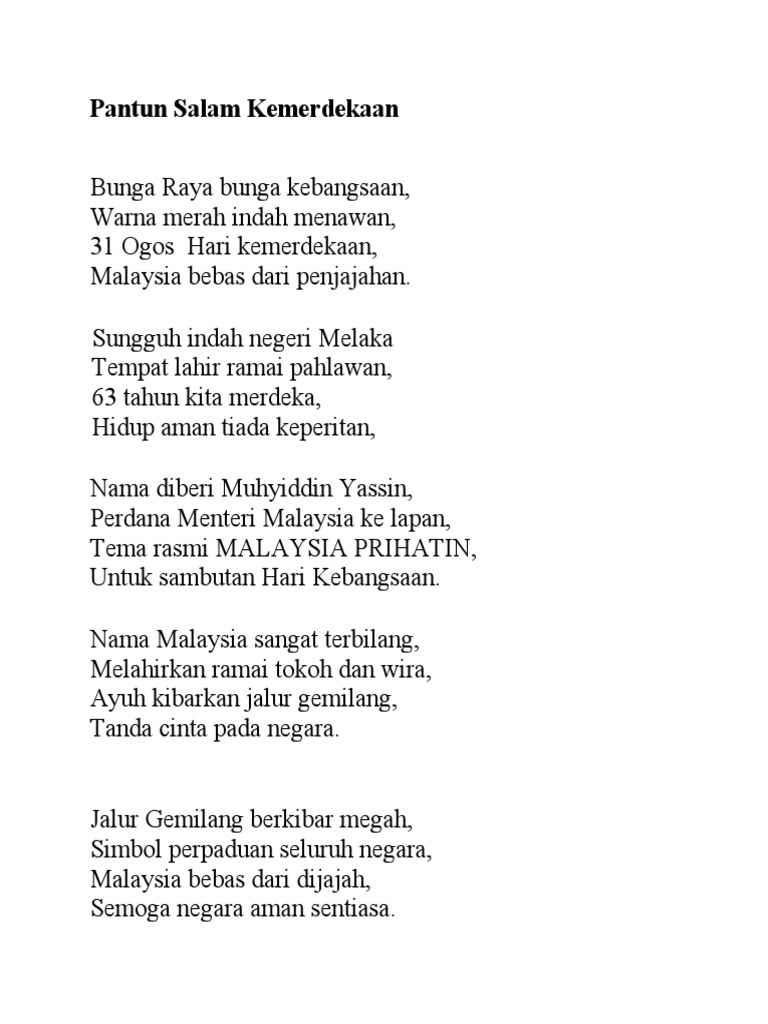 Have just read the article entitled pantun kemerdekaan sekolah rendah. KETAATAN DAN KEBERANIAN Berjanjilah kami demi keberanian melalui suara-suara hijaz putaran kemerdekaan menyusur sungai-sungai mati. Himpunan Sajak Merdeka.